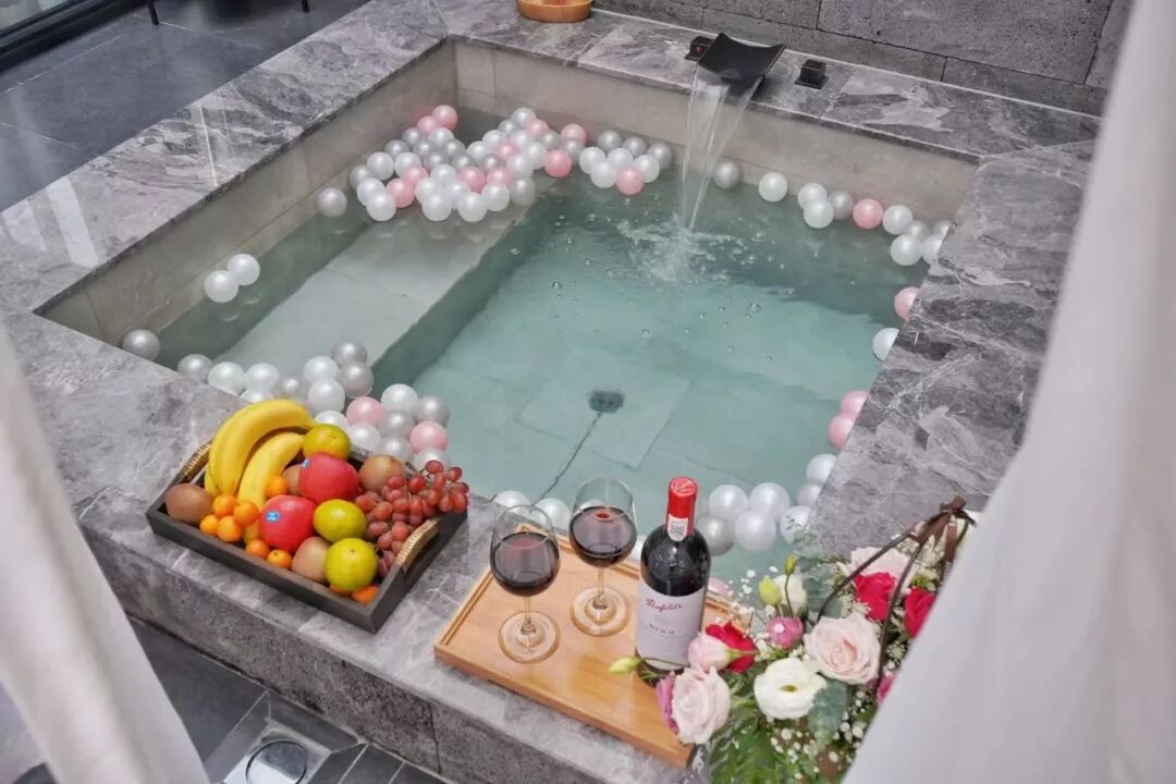 不得不夸赞一下安排的是如此的让人心动。泡泡球在水上飘动,四周散发着热气...躺在水里,感觉整个身体都通畅了,既美容,又养颜,还养生。再来上一杯红酒,没有什么比此时此刻更令人放松。