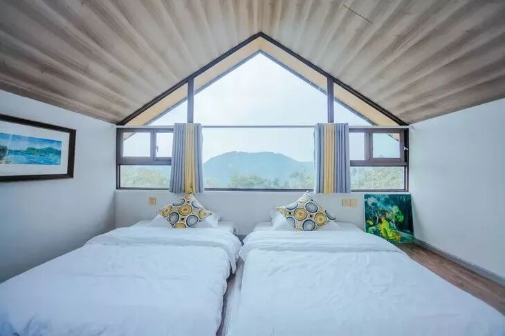 木屋二楼卧室里的床头、天窗处都使用了透明玻璃,既能看得到风景,又能挡住窗外蝉鸣。随性靠肆意躺,白天看群山连绵,入夜赏星空银河,好像睡进了大自然。大床房与双人床的设计,满足朋友聚会的住宿需求。