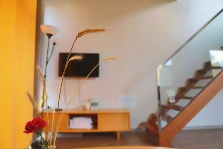 依山而建的小木屋里,柔软舒适的沙发、原木楼梯、落地灯、蒲团,让这里有着家一般的温暖舒适。