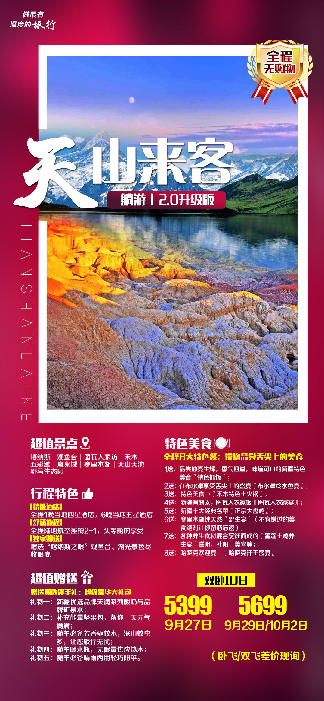 特色:≯尽享新疆美景≯品新疆味道≯赏新疆歌舞≯专注旅游体验……定制高端尊贵VIP之旅